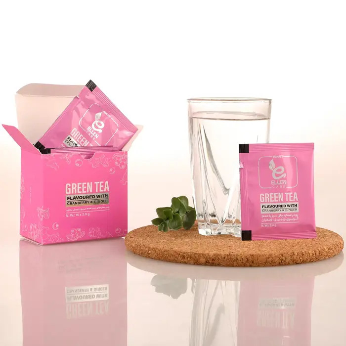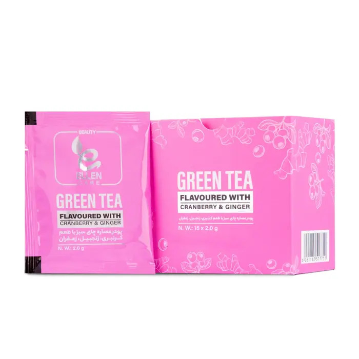 پودر عصاره چای سبز الن کر با طعم کرنبری، زنجبیل و زعفران بسته 15 عددی